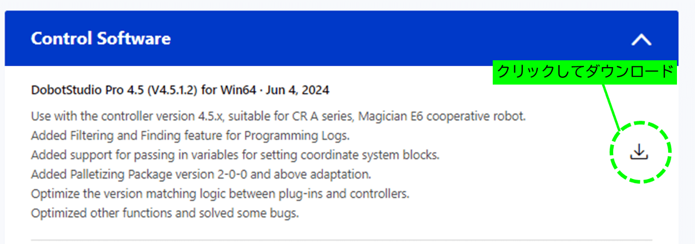- 「Control Software」から【Dobot Studio Pro 4.5】をダウンロードしてください。