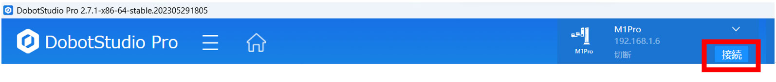 - 8) DobotStudioProを起動し、M1Pro「接続」を押します。「検索中」のままの場合は、未接続状態であり、通信設定エラーが残っています。