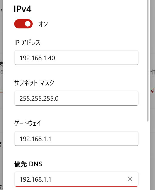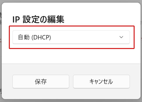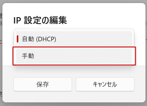 - 7)デフォルト設定は「自動(DHCP)」になっているため、手動でIPを割り当てます。