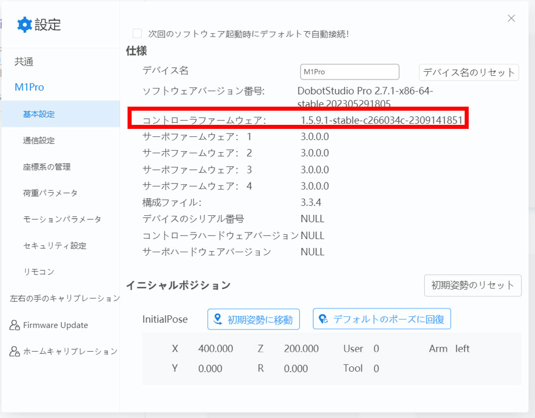 - 7) M1Proを再起動後、DobotStudioPro上で接続しコントローラファームウェアが更新されているか、確認してください。