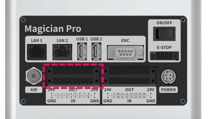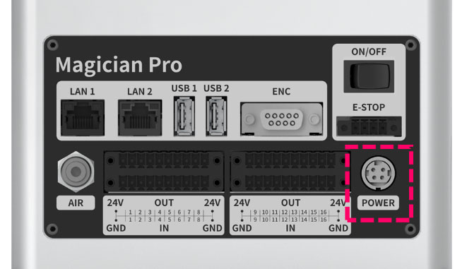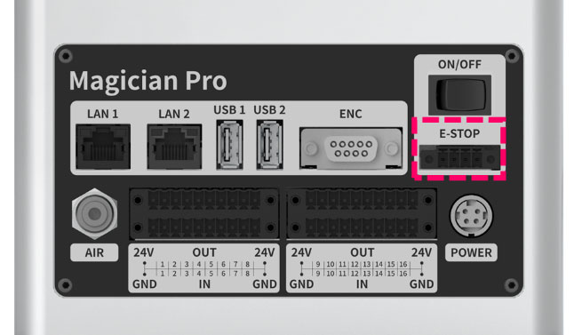 【ESTOP】と書かれた場所に非常停止ボタンのプラグと挿してください。