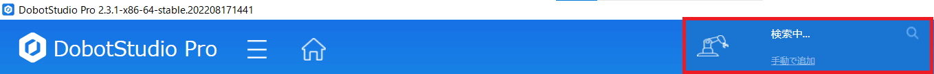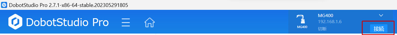 - 9) DobotStudioProを起動し、MG400「接続」を押します。 ※「検索中」のままの場合は、未接続状態であり、通信設定エラーが残っています。 その場合、一度MG400とDobotStudio Proを再起動をお試しください。