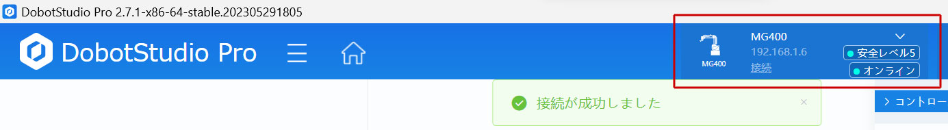 - 10)「オンライン」状態になっていれば設定完了です。MG400の操作・制御が開始できます。