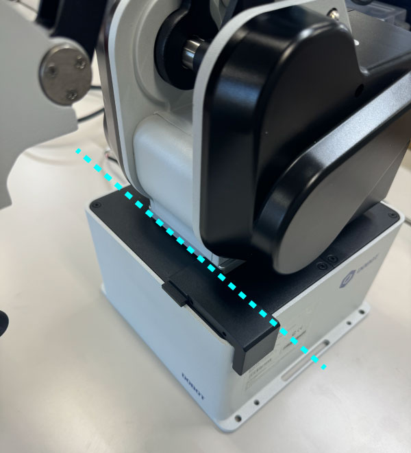 - 1軸の調整を行います。アームはハンドガイドで動かし、【Zero Position Fixture】を当てて正面を向くように位置を調整してください。