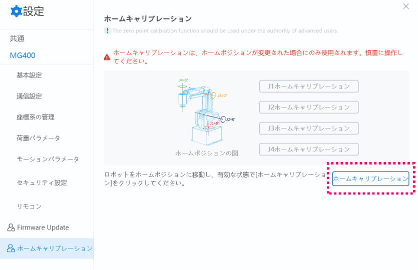 ホームキャリブレーションとは、原点位置を調整する作業のことです。アームに強い衝撃を加えた場合など、MG400の原点位置がずれてしまった場合には、ホームキャリブレーションが必要となります。