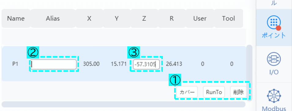 長押ししている間、アームが指定したポイントまで移動します。 - 【削除】
