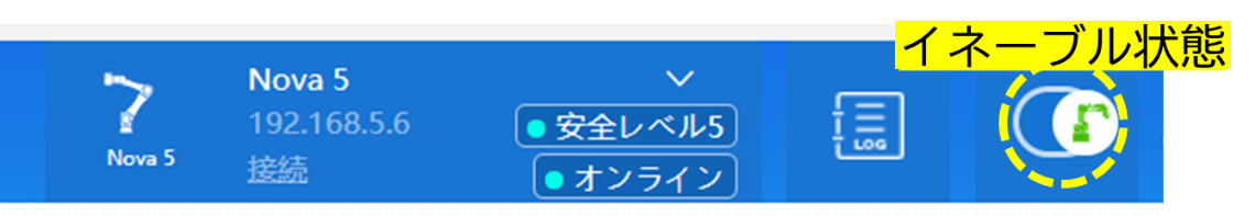 - インジケータライトが青点滅に変わり、Dobot Studio Pro上では、イネーブルボタンが光ります。この状態になればハンドガイドモードに切り替わっていますので、自由にアームを動かせるようになります。可動域内でゆっくり動かしてください。