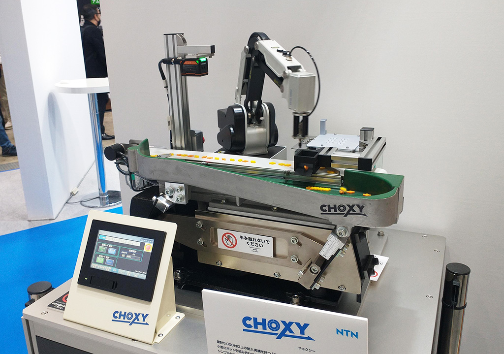 NTN社の新型フィーダ「CHOXY」と協働ロボット「DOBOT MG400」を融合した直進フィーダ&ピッキングシステムです。“瞬時”に品種切り替えを実現し、段取り替えロスを激減させ「作業者1人分」の自動化を低コストで実現します。