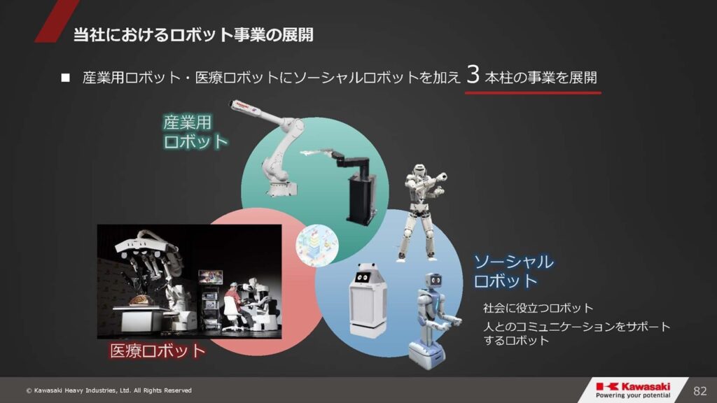 先ほどご紹介した手術支援ロボット「hinotori」などの医療ロボット、今後活躍するソーシャルロボット、そして既存の産業用ロボット、これらを3本の柱として事業展開する、それが川崎重工における総合というイメージです。