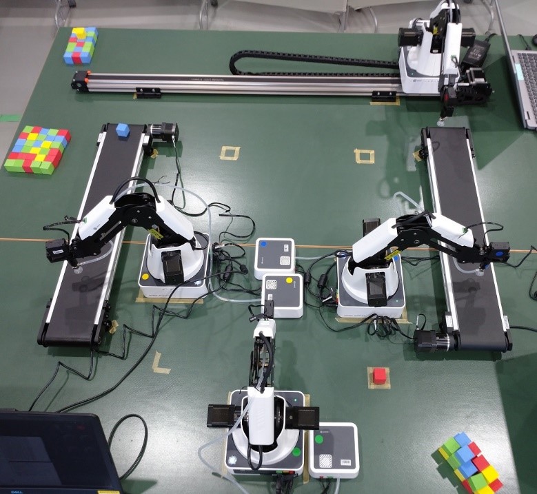 模擬生産ラインシステムを構築する際に、産業用ロボットアームを使用すると、サイズがとても大きいため、システム全体を俯瞰して見ることは難しいです。そこで、サイズがコンパクトな小型ロボットアームを活用することで、テーブルの上で模擬生産ラインシステムを構築することができ、システム全体を俯瞰で見ながら学ぶことが可能となります。