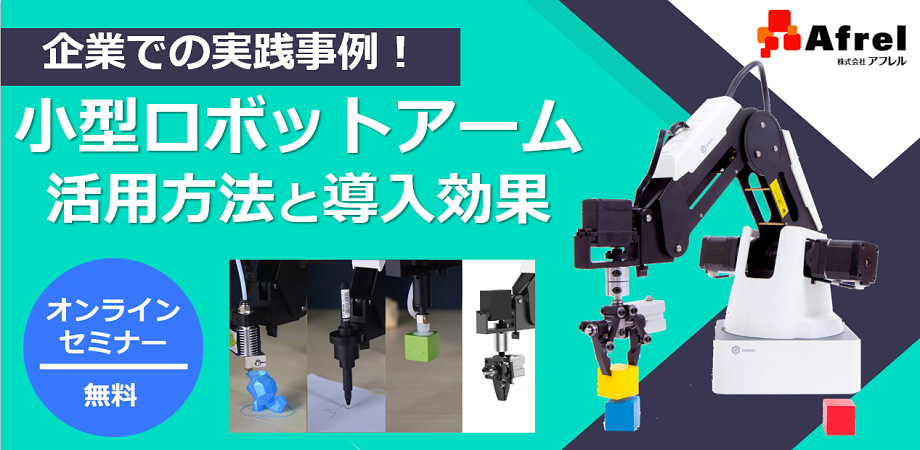 | タイムスケジュール | 1.企業で小型ロボットアームが導入されている3つの理由 2.企業活用事例紹介 3.まとめ:小型ロボットアームで得られる効果とは 4.質疑応答 |